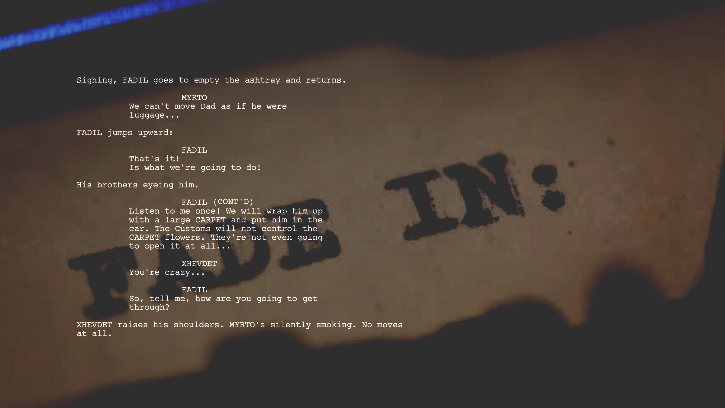 Based on an actual event, “CARPET” is the story of three immigrant brothers in Greece and their father, who passed away on foreign soil. The boys want to fulfill his last wish, returning his body to their homeland, Albania. From the conversation with the Greek funeral employee, despite his kindness, it seems impossible to realize their father’s will, as the price of transport across the border is extremely high and unbearable for them. They fall into despair, but an idea as dreadful as well as genius of the younger brother gives them hope. They will transport THE BODY across the border as purchased goods, rolled up in a giant CARPET, tied over the car. In this way, they will avoid many questions, suspicions, investigations, and allegations of corpse transport. They decide, buy THE CARPET, get ready and depart, nervous about what might happen at the border.